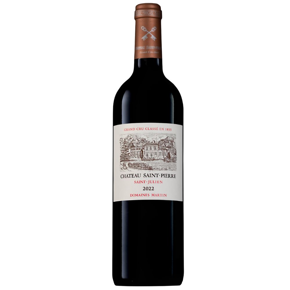 Situé au cœur de l’appellation Saint‑Julien sur la rive gauche de Bordeaux, le Château Saint‑Pierre figure parmi les crus emblématiques du Médoc. Ce domaine historique appartient aujourd’hui aux Domaines Henri Martin. Avec ses 17 hectares de vignes, il constitue le plus petit des crus classés de l’appellation, tout en bénéficiant d’un terroir particulièrement réputé. En 1982, Henri Martin, également propriétaire du Château Gloria, acquiert la propriété et entreprend de reconstituer patiemment le vignoble tel qu’il existait lors du classement de 1855. Aujourd’hui, le domaine est dirigé par Françoise et Jean‑Louis Triaud, ainsi que leurs enfants, perpétuant l’héritage de la famille Martin. Le vignoble du Château Saint‑Pierre est implanté sur un terroir de graves günziennes reposant sur une base argilo‑calcaire, typique de l’appellation Saint‑Julien. Les vignes, âgées d’environ cinquante ans en moyenne, sont plantées majoritairement en cabernet‑sauvignon, complété par le merlot et le cabernet franc. Les vins de Château Saint‑Pierre se distinguent par leur style élégant et harmonieux. Ils offrent une belle concentration, soutenue par des tanins fins et soyeux. À la dégustation, ils dévoilent un fruit éclatant accompagné de notes d’épices et d’une subtile touche boisée. Structurés et équilibrés, ces vins possèdent un excellent potentiel de garde et illustrent parfaitement la finesse et la profondeur caractéristiques des grands crus de Saint‑Julien.